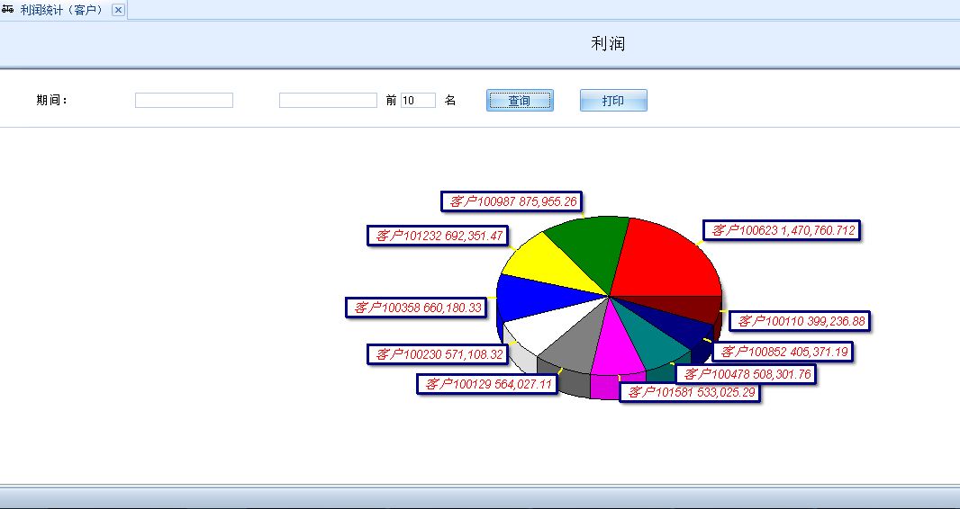 • 统计分析管理 -统计结果由表格和图表形式显示 -操作货量统计分析 -操作工作量统计分析 -税金统计分析 -客户利润统计 -销售利润统计 -部门利润统计 … • 统计分析 部分界面截图(点击小图查看大图) 客户利润统计图表