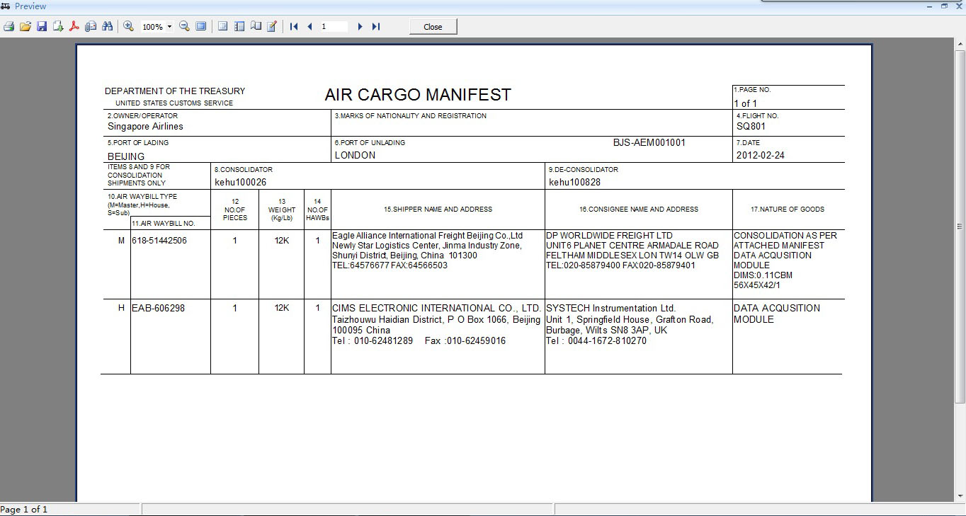 空运出口主单、舱单、托书、报关单、报检单、账单等,直接导出PDF,JPG, EXCEL等易用格式